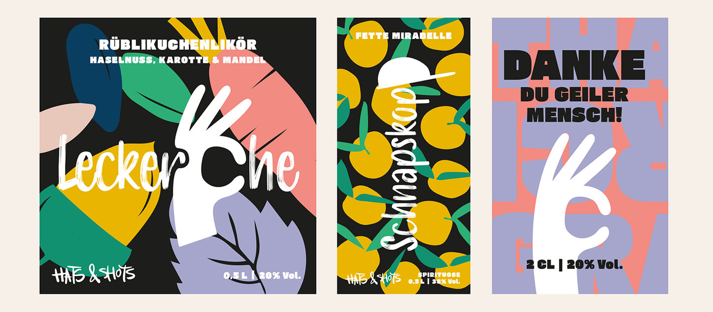 Für Hats&Shots, die ursprünglich für ihre hochwertigen Made-in-Germany-Caps bekannt waren und kurze Zeit später ihr Sortiment um Schnaps und Likör erweitert haben, durfte ich das Redesign der Flaschenetiketten konzipieren und realisieren. Die Zusammenarbeit mit den beiden Inhabern, mit denen mich eine enge und vertrauensvolle Beziehung verbindet, war eine großartige Erfahrung. Die Spirituosen überzeugen nun nicht mehr nur geschmacklich, sondern sind auch optisch ein Highlight. Es erfüllt mich mit großer Freude, Startups wie Hats&Shots auf ihrem Weg zu begleiten und deren Entwicklung und Wachstum aktiv zu unterstützen.